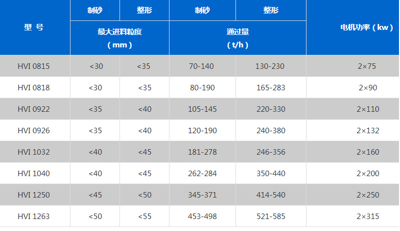 1.原物料和物料需求 從表格中可知,以HVI 0818為例,破碎30mm以下的砂子,每小時的產量在80-190噸不等,破碎35mm左右的砂子每小時產量在165-283噸左右,物料需求越小,則破碎時間越長,效率相對較低,同理原物料較大的破碎起來會慢一些。
